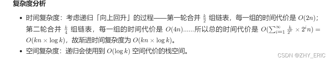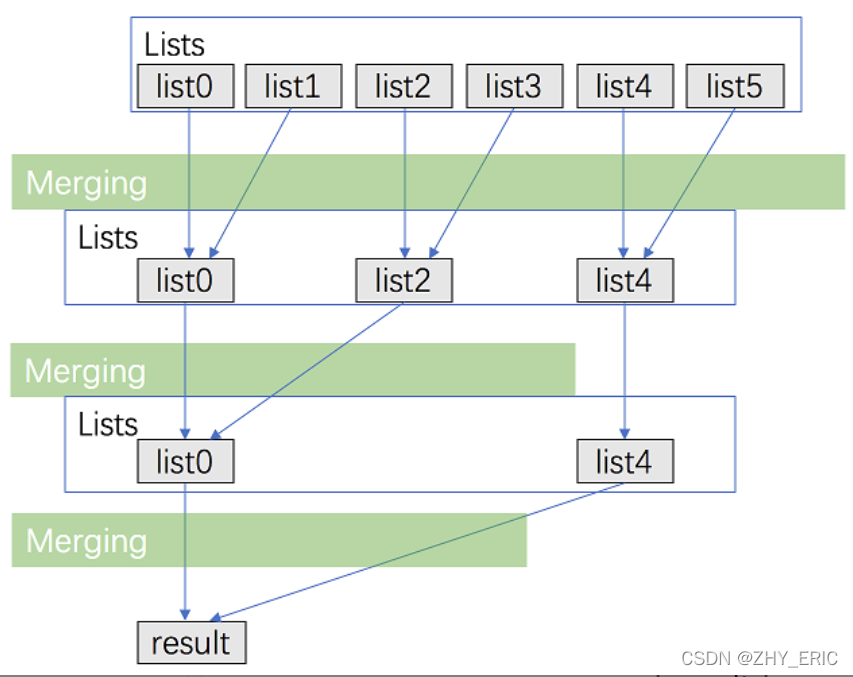 ????????将 k?个链表配对并将同一对中的链表合并;第一轮合并以后, k个链表被合并成了 k/2? ? 个链表,平均长度为? nk/2??,然后是k/4个链表, k/8个链表等等;重复这一过程,直到我们得到了最终的有序链表。