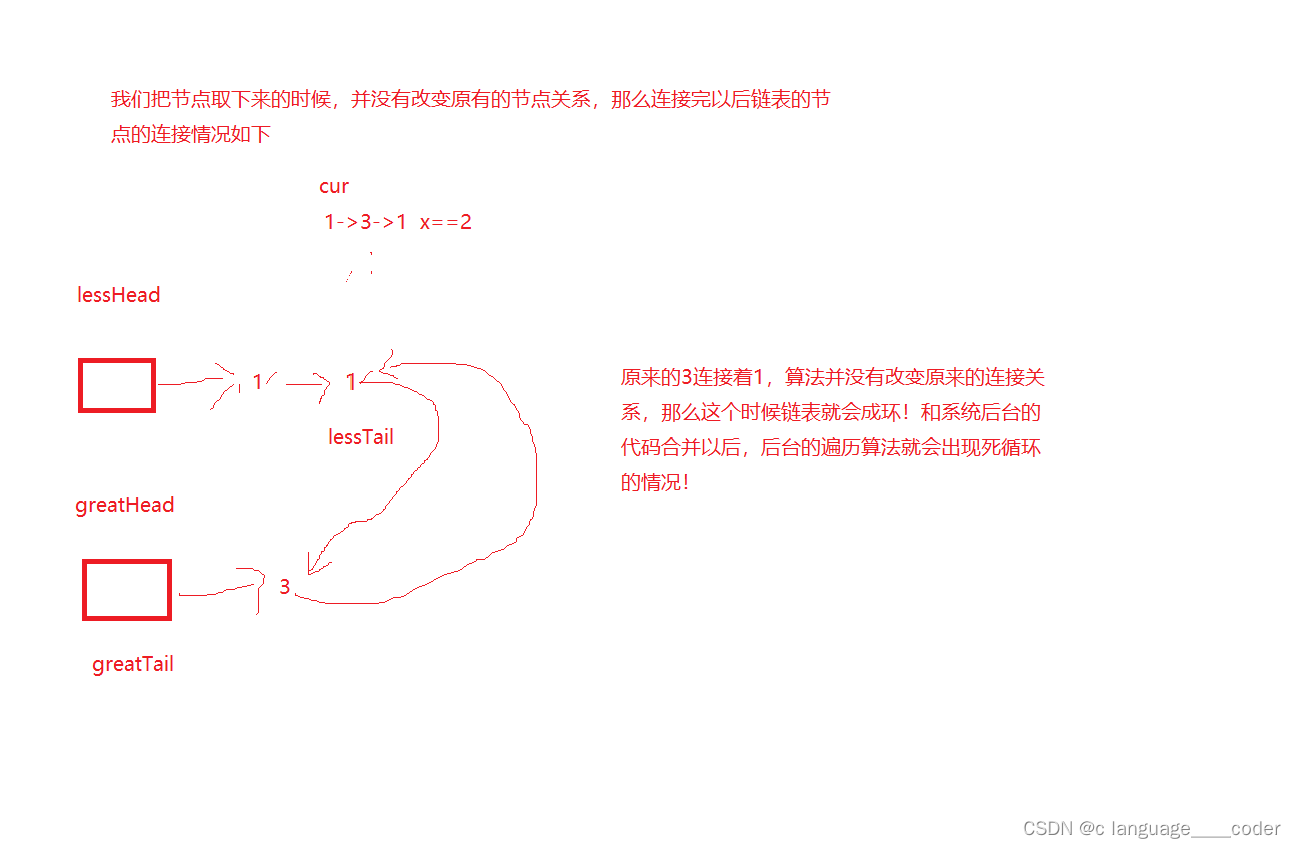 struct ListNode* lessTail=lessHead,*greatTail=greatHead;