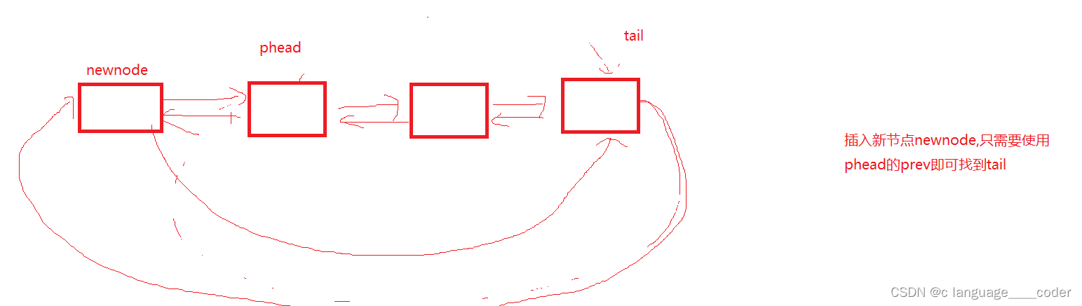 接下来就是处理尾插的情况,这时候结构的优势就体现出来了!如果是单向链表,那么你需要遍历找尾节点,然而在双向循环就不用,因为头节点的前驱就是尾节点!