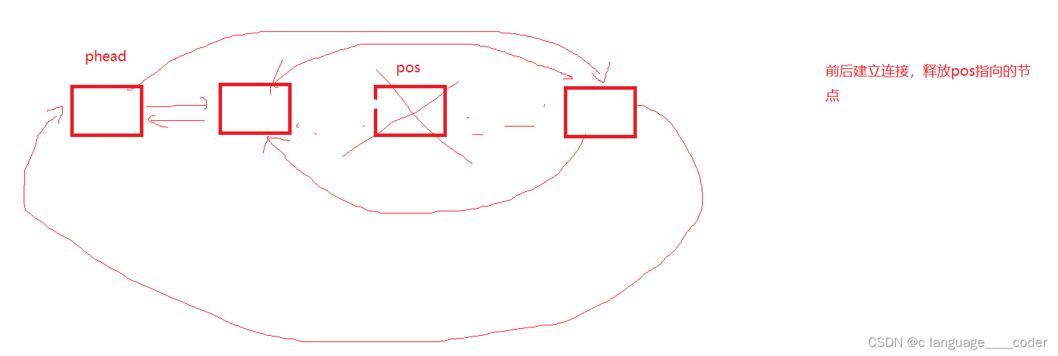 接下来,我们实现在任意位置删除的算法Erase,和insert的处理方式很相似,我们需要同时保存pos的prev和next,接着将pos释放:
