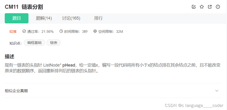 这道题的难点并不在于解决问题的思想,而是在于你对代码的控制能力,而接下来的这道分割链表则就是能真真正正地考察出你对链表的理解和代码控制能力!