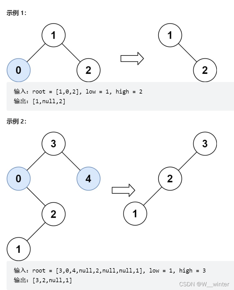 1、确定递归函数的参数和返回类型,因为是要遍历整棵树,做修改,其实不需要返回值也可以,我们也可以完成修剪(其实就是从二叉树中移除节点)的操作。但是有返回值,更方便,可以通过递归函数的返回值来移除节点。
