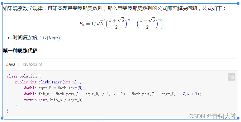 ????????在考虑第x阶是怎么爬上来的情况时,分为两种情况,一种是爬1阶上来的,一种是爬2阶上来的。那么f(x) = f(x - 1) + f(x - 2)。递归解法中也是这么写的。