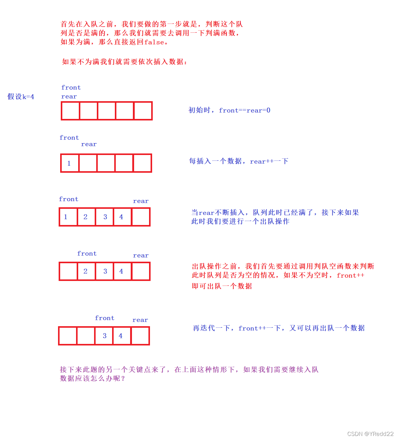 思路:当我们刚开始拿到这个题的时候,如果对循环队列没有概念的情况下,第一反应大家都一定会去想,需要存放k个数据,我们应该怎么去开辟内存空间呢?我在思考这个题目的时候,也真的是没能想到去开辟k+1个空间的办法,那么知道这个开辟办法过后,我们应当去思考这样设计的目的是什么?为什么设计k个空间行不通呢?