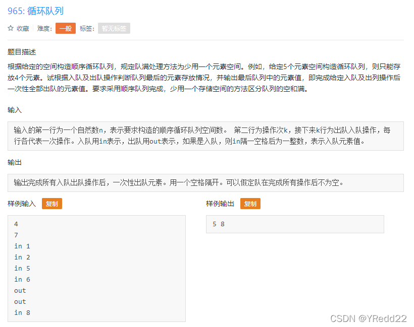 今天在刷学校OJ题目的时候做到了这道关于循环队列的题目,说实话这个题刚开始真的没有任何思路,实在是想不出来很好的解决办法,但是当我想起一道在LeetCode上做的一道循环队列的题目时突然对循环队列这个东西有了一点思考,但是即使是做过LeetCode的这道题也还是没能想起这个题重点思路,所以决定好好把循环队列的解题方法和关键思路重新巩固梳理一下。