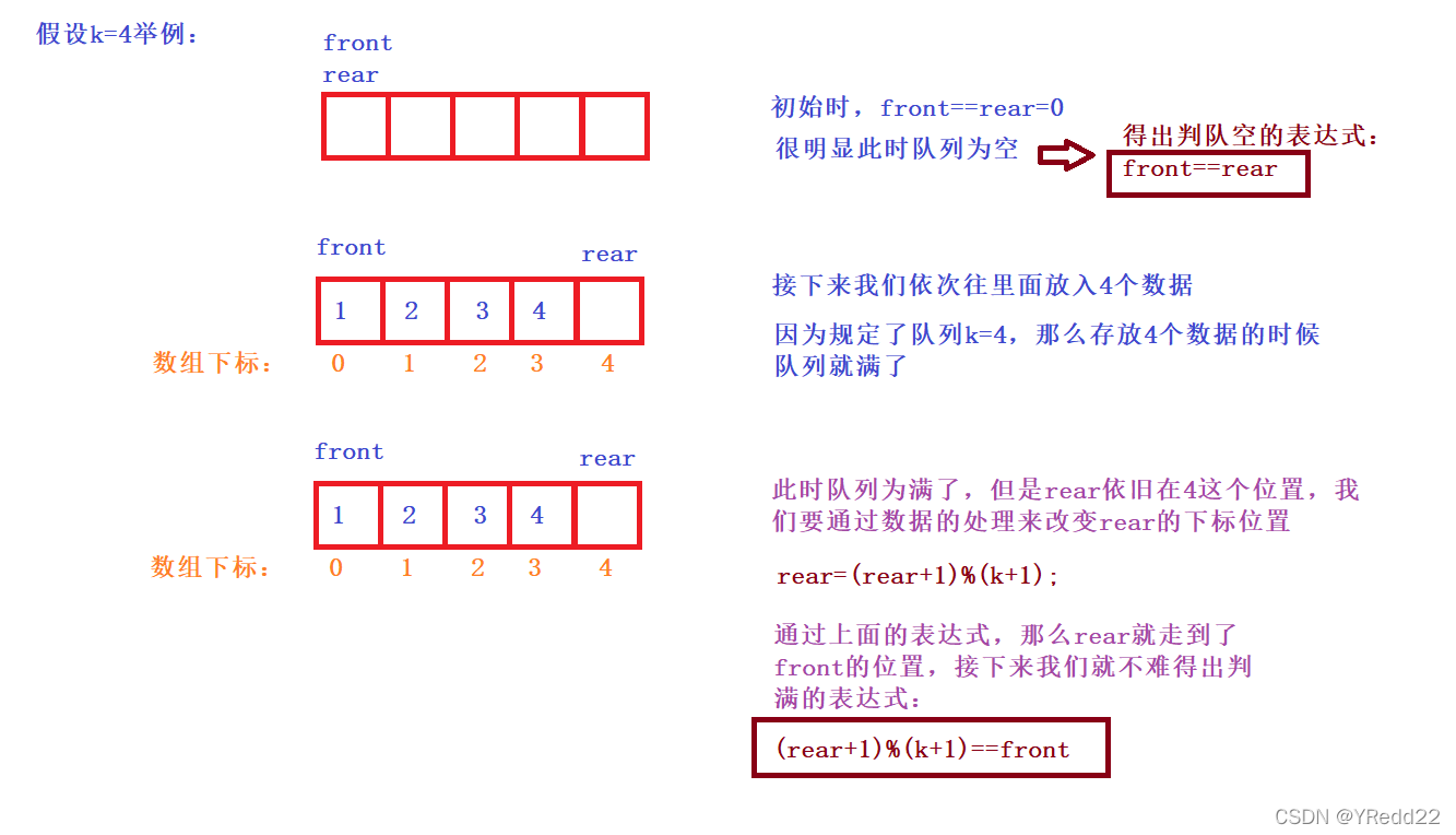 通过上图可以看出需要判空和判满我们则需要开辟k+1个空间来实现循环队列,那么我们再来举一个具体的实例看看:
