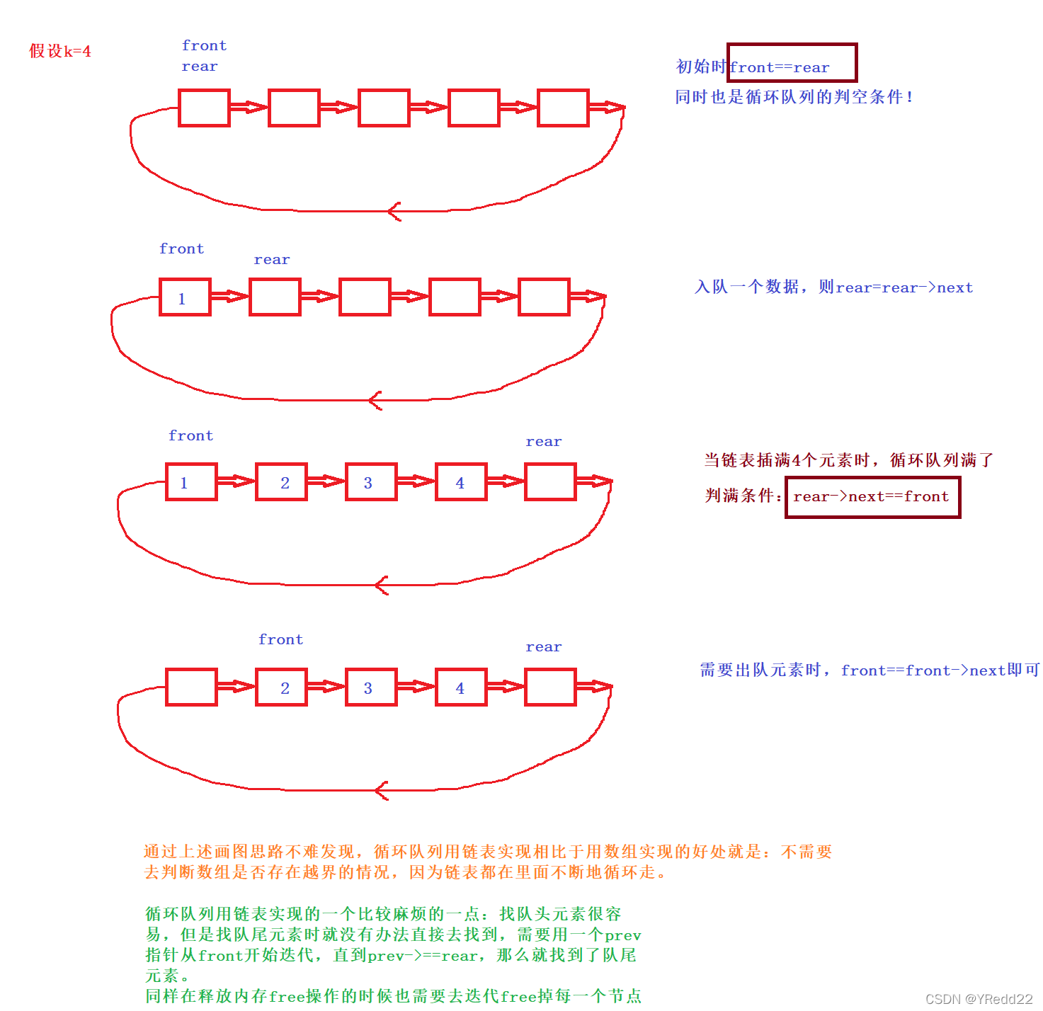 用链表的方式实现循环队列: