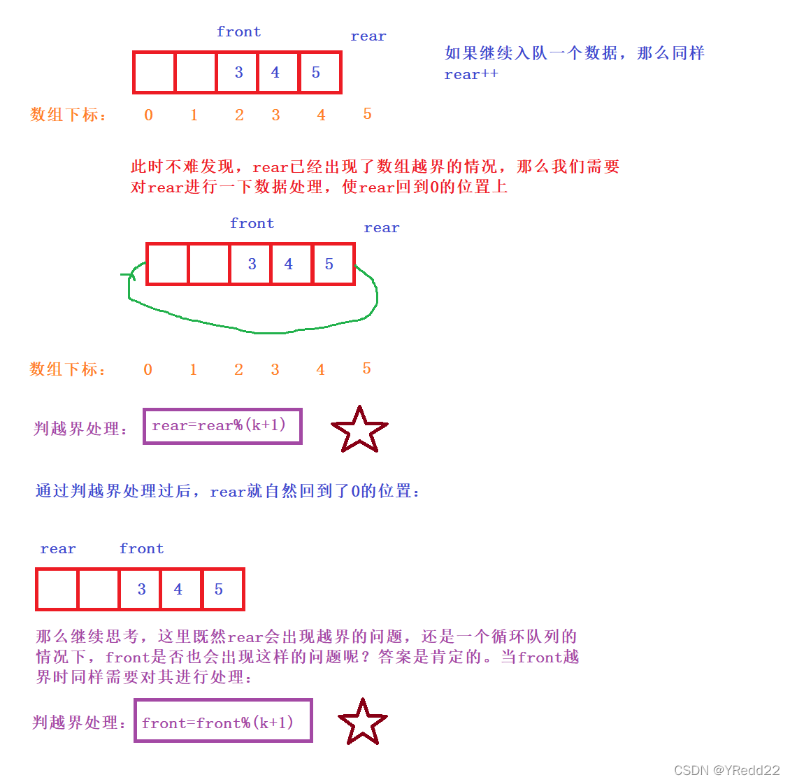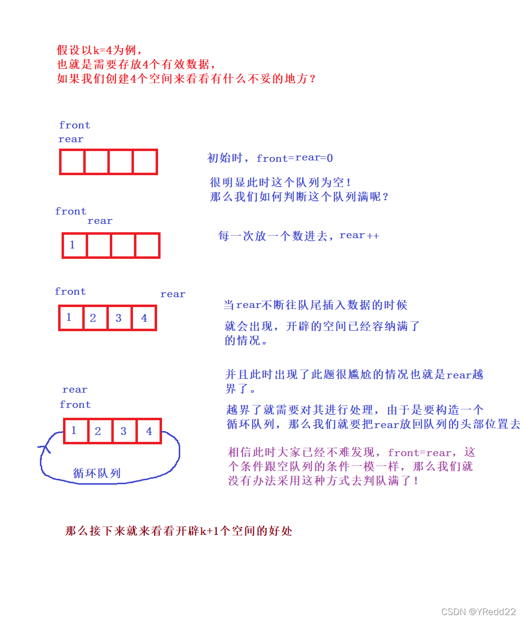 上面这段代码中,先给结构体开辟空间,front和rear赋初值都给0,然后k赋值给结构体中的k。以上三个步骤不容易出错。但是这个数组却开辟了k+1个空间?这是为何呢?接下来画图说明一下: