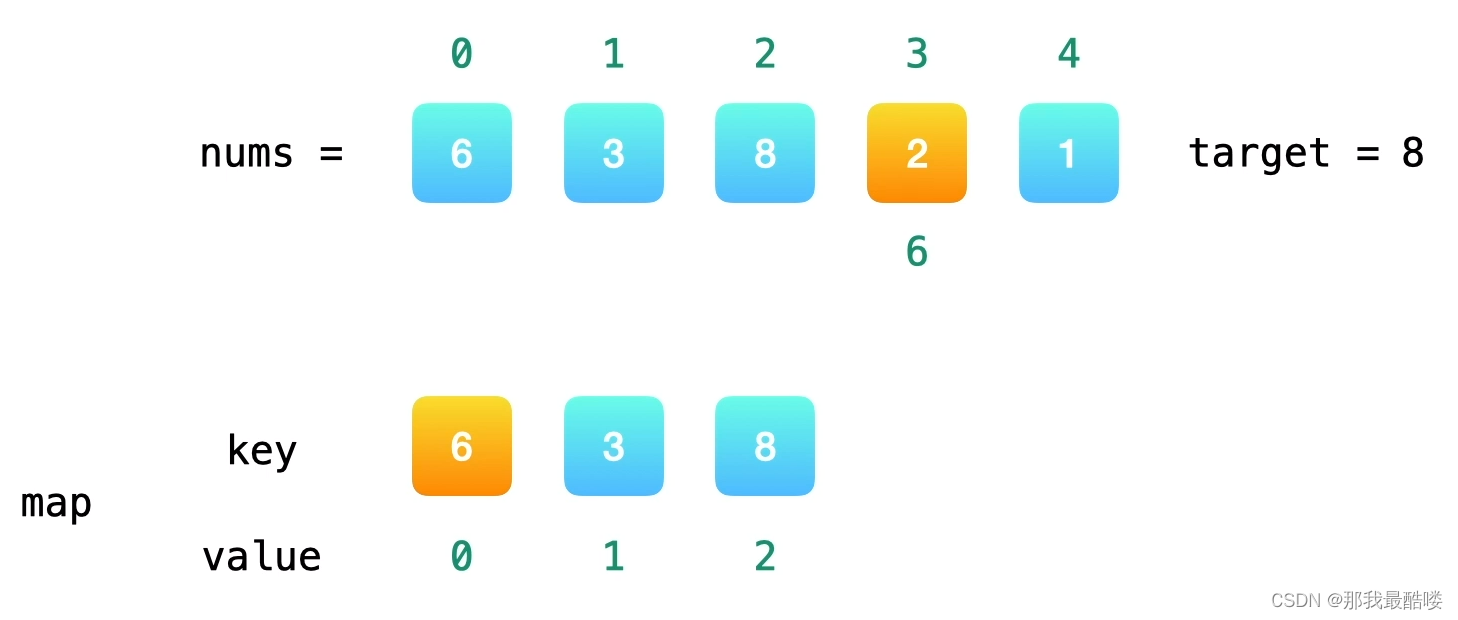 nums[0]=6,需要找2,哈希表中没有,则存入key为nums[0],value为其在数组中的下标值0;nums[1]=3,需要找7,哈希表中没有,则存入key为nums[1],value为其在数组中的下标值1;nums[2]=8,需要找0,哈希表中没有,则存入key为nums[2],value为其在数组中的下标值2;nums[3]=2,需要找6,哈希表中有,则输出key为6时对应的value,即为其在数组中的下标;