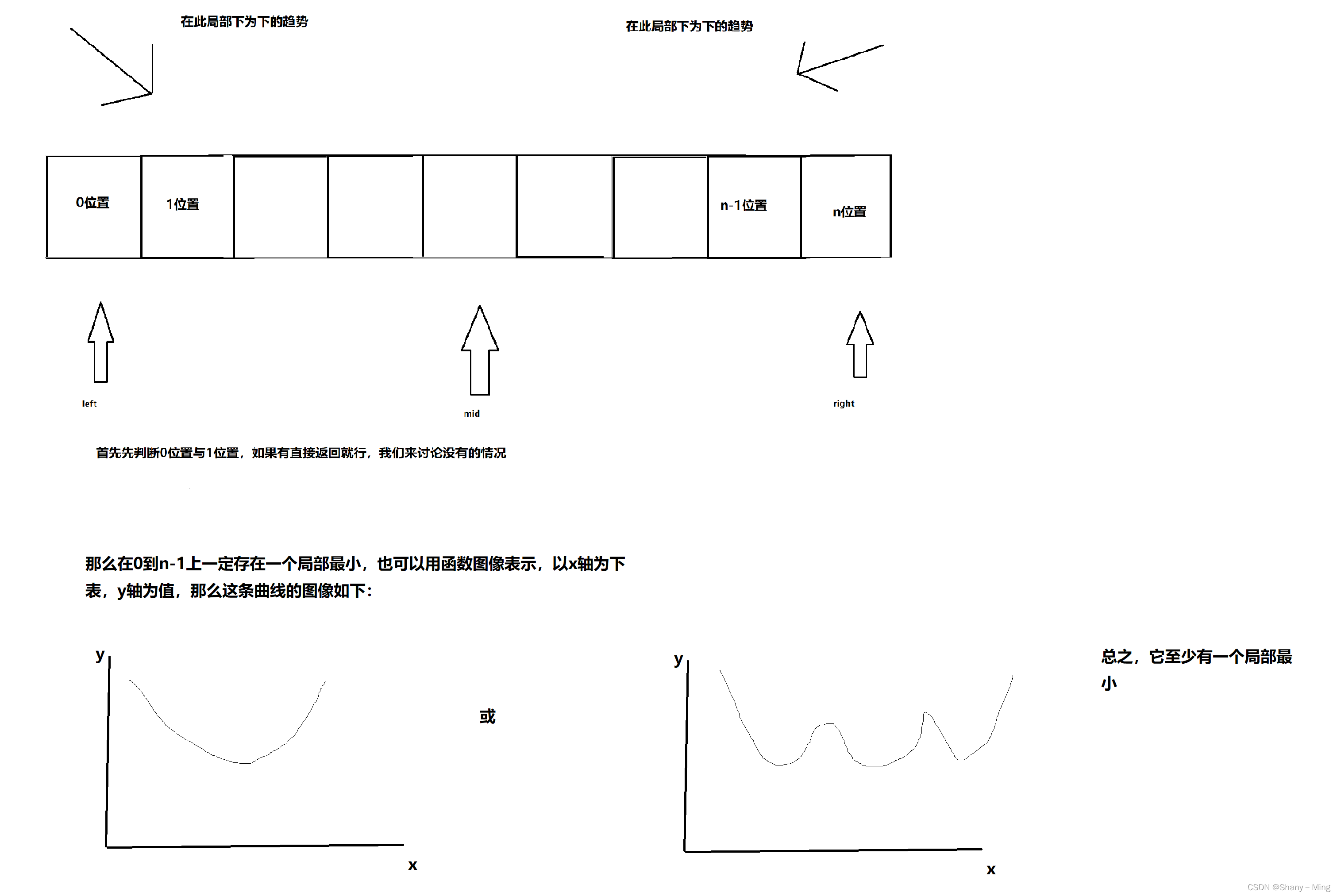 给定无序数组arr,且其中相邻两个数一定不相等,例如0位置上的数小于1位置上的数,那么0位置局部最小,如果n-1位置上的数比n-2位置上的数小,那么n-1就是局部最小,如果i<i-1且i<i+1,那么,i是局部最小。