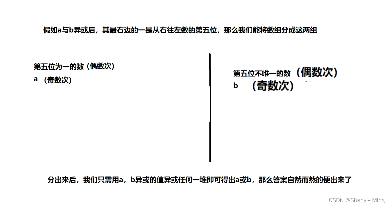 这段代码其实是在做区分,前边说了,两个出现一次的数异或其结果必不是0,那么,我们便找到其最右边的一(上一步),把整个数组分为两部分:一部分是这位上含一的,一部分是不含一的