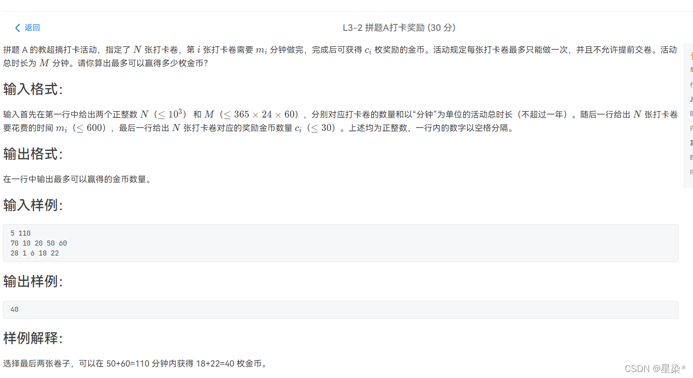 if(dp[i]<=m){//时间满足小于等于时间限制时就是所求最大金币数