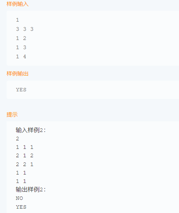对于每组测试数据,输出” NO”,表示离开时有人还有歌没唱完,否则输出” YES”。(不包括引号)。