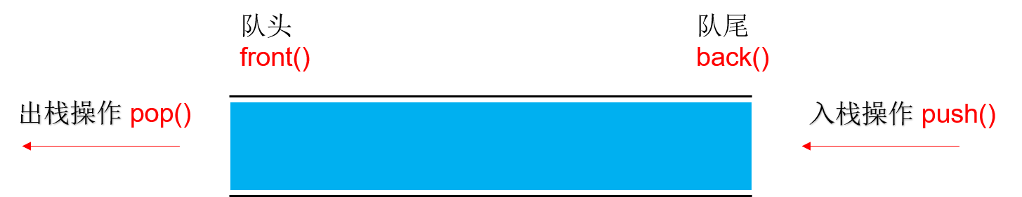 入栈操作:push(xx) 出栈操作:pop() 返回第一个元素:front() 返回最后一个元素:back() 原为为空:empty() 主要操作示意图: