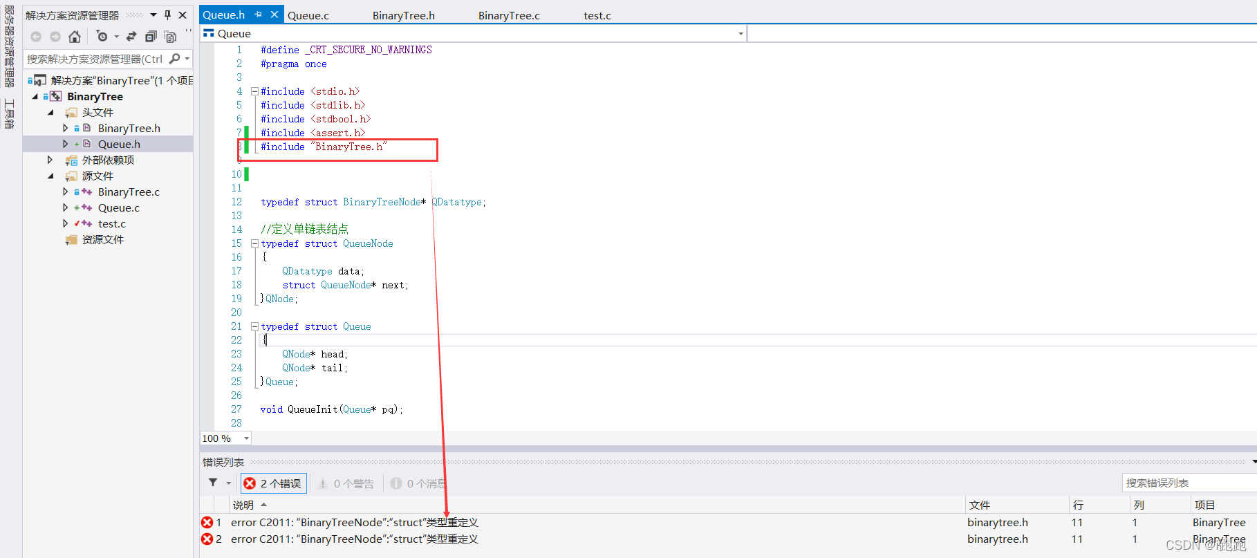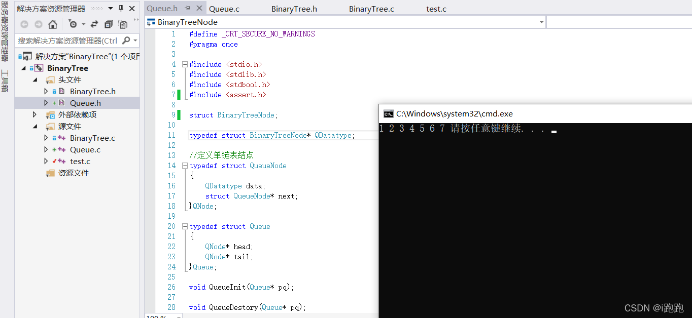 .c中要创建队列,我们将队列.h文件放入二叉树.h文件中即可