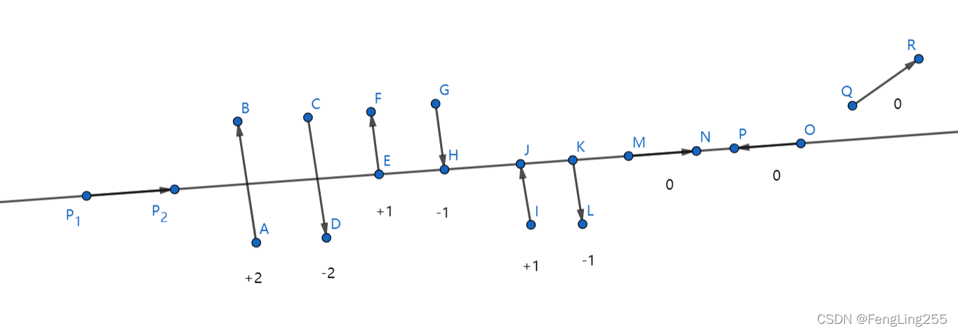 接着考虑,“跨越”该如何定义。对于任意一条边,计算其的一个整型值 flag,代表这条边的跨越方式。边和直线所有可能的位置关系如下图所示。  当边的端点在直线两侧时,flag 为