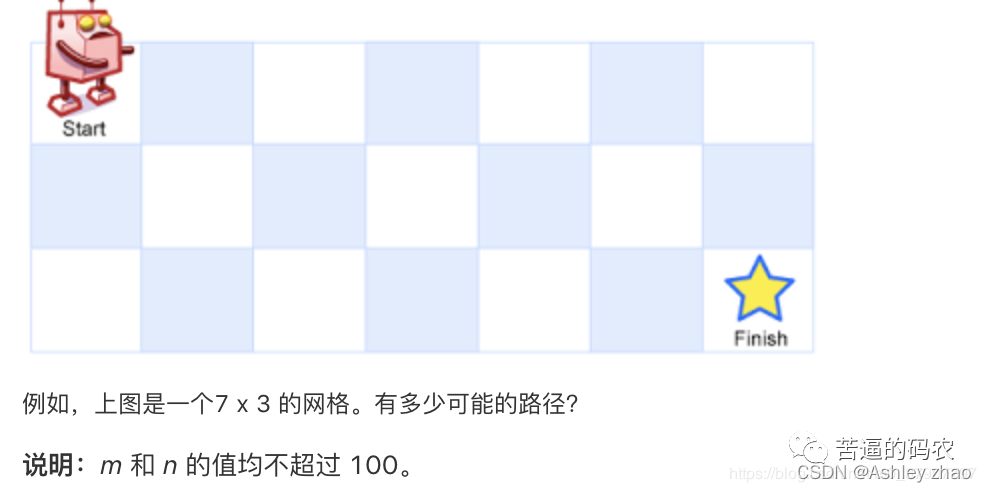 可以说,80% 的题都是要用二维数组的,所以下面的题主要以二维数组为主,当然有人可能会说,要用一维还是二维,我怎么知道?这个问题不大,接着往下看。 问题描述:一个机器人位于一个 m*n 网格的左上角 (起始点在下图中标记为“Start” )。机器人每次只能向下或者向右移动一步。机器人试图达到网格的右下角(在下图中标记为“Finish”)。问总共有多少条不同的路径?