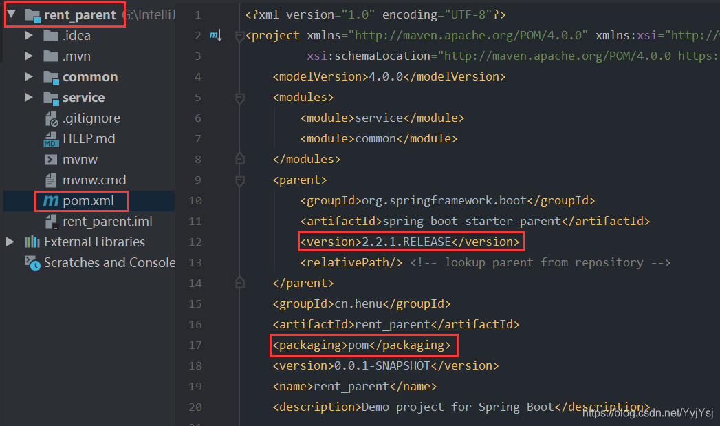3、把父工程中pom.xml文件中的版本改为2.2.1RELEASE,并把父工程的类型改为pom类型(加上pom)