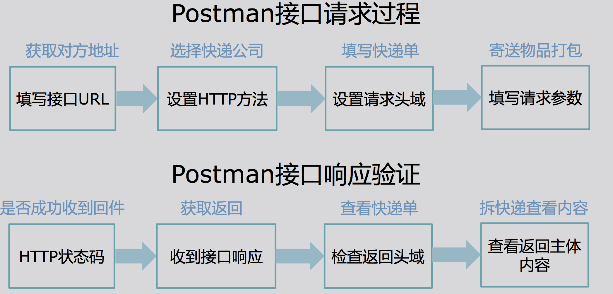 简单理解,接口收发包的过程就像通过快递公司寄快递,需要知道对方的地址(URL)、选 择快递公司(HTTP方法)、填写快递单(头域信息)、包装快递物品(发送请求体参数)