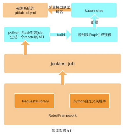 4.2 用例设计 4.2.1 用例设计,根据业务场景设计测试用例,方便后续实现 4.2.2 测试数据构造,预置不同环境的测试数据,供实现调用 5 整体实现架构  接口测试实现层:在RF,通过引用默认关键字 RequestsLibrary (实现http请求)和通过python自定义关键字来完成用例实现的需求; jenkins调度:在jenkins上配置一个job,设置好RF用例执行的服务器和发送给服务器相关的RF执行的指令,并且在jenkins中配置好测试报告模板,这样用例便可以通过jenkins完成执行并发送测试结果给项目干系人; 生成用例执行的API:上图中蓝色部分,就是为了将jenkins的job生成一个可访问api接口,方便被测项目的CICD集成; 集成到被测系统CICD流程:将上面步骤中封装的API配置在被测应用的__gitlab-ci.yml__中,完成整个接口自动化的闭环
