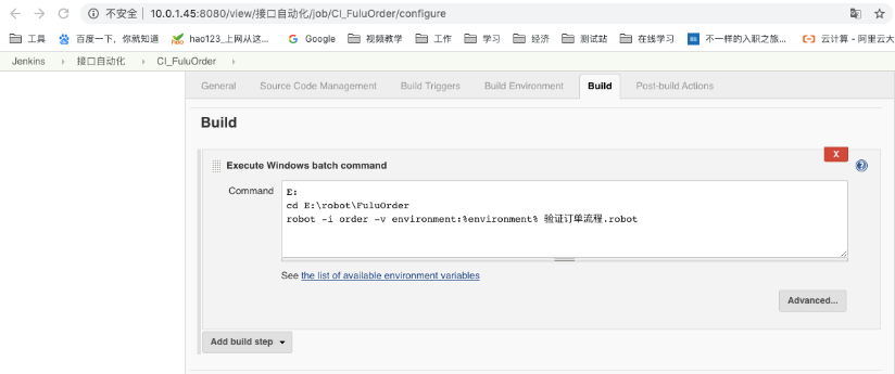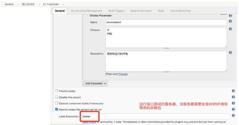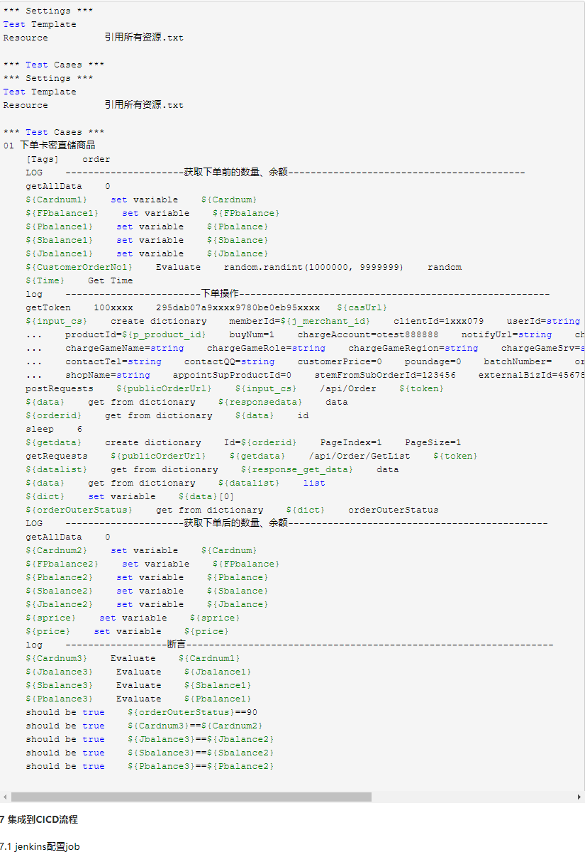 getEnvDomain 用于从自定义的configs.ini文件获取对应环境的微服务的请求域名 configs.ini的内容  excelTodict 用户将excel中的内容作为字典返回 getToken 提供接口下单的授权token getAllDate 获取该用例下的所有数据 实现demo  jenkins发送RF执行的命令 7.2 封装的jenkins_job的执行接口地址 通过python的flask框架,根据测试和pre两套环境包一层jenkins的job执行接口 7.3 将上述flask封装的接口打包成镜像 根据dockerfile生成镜像 7.4 将镜像部署到kubernetes,对外提供服务 供触发测试执行的调用入口 ,这部分封装的接口部署在本地的k8s集群下ordermiddle
