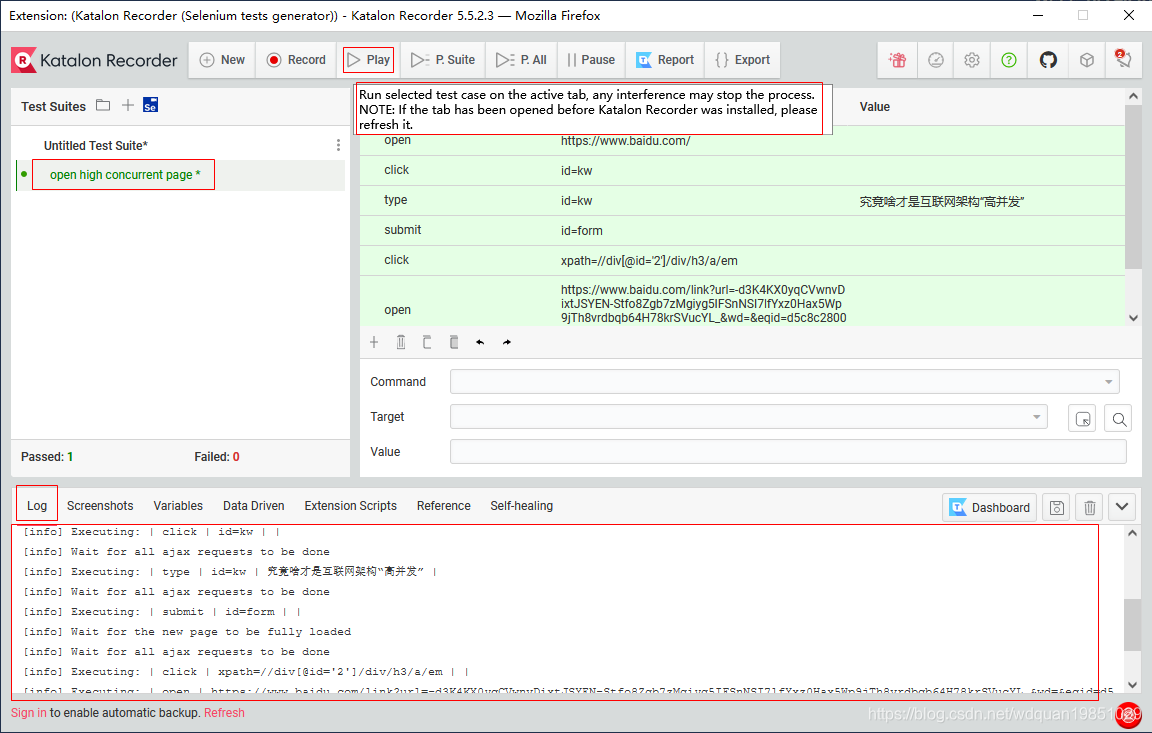 点击一下play,火狐浏览器将会执行一次生成的脚本,自动化的完成刚刚的操作(关闭弹窗阻止,或者将掘金和百度加入不阻止弹窗列表)