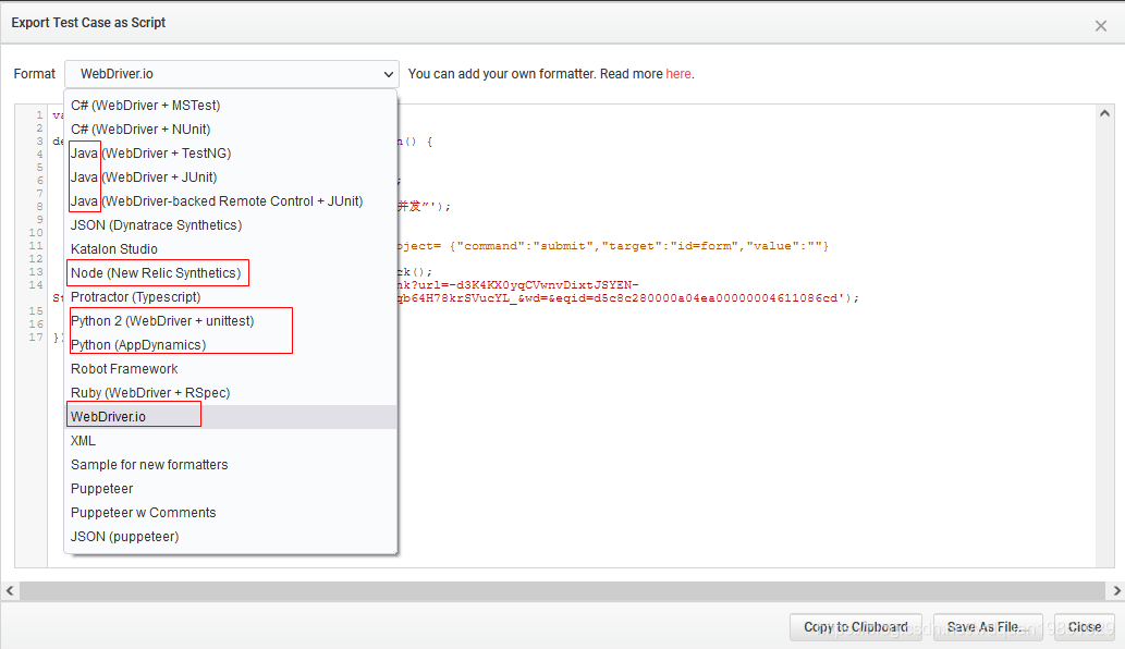 ?可以看到有各种语言 Java、C#、python2等。 我们选择"WebDriver.io",会以js格式导出脚本。