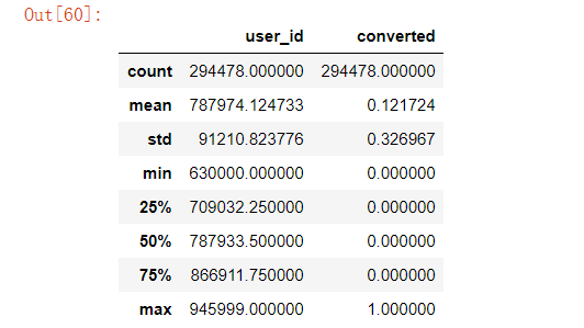 user_id :用户ID ? timestamp :用户行为时间戳 ? ? ? group :分组标签:control-对照组;treatment-实验组 ?? landing_page :展示的页面版本 ?? converted :是否转化:0-没有转化;1-有转化 ? ?