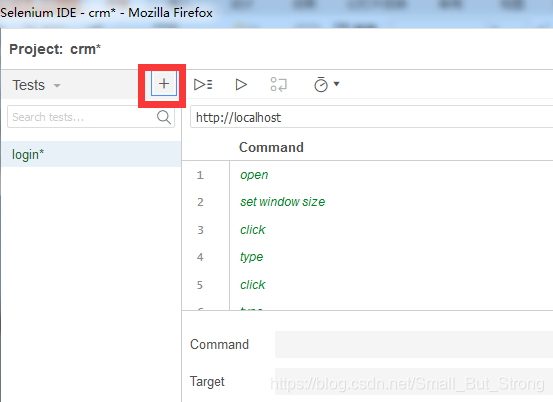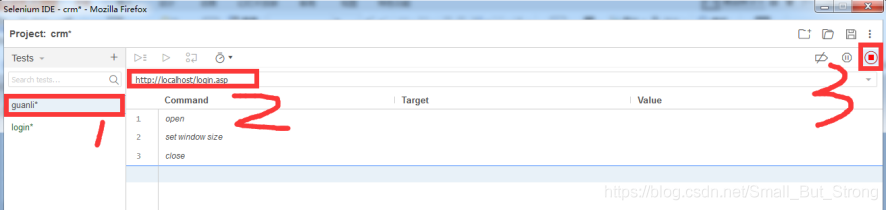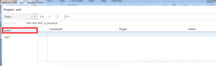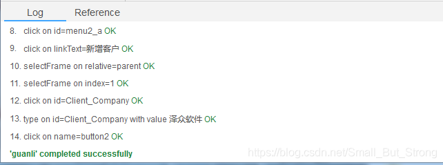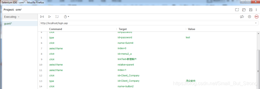 操作步骤: 1、打开火狐浏览器打开selenium   2、在crm项目下新建脚本guanli    3、选中脚本,补全url后开始录制   4、录制的脚本如下 输入用户名test,输入密码test,点击登录按钮,点击客户管理,点击新增客户按钮,输入客户名称:泽众软件,结束录制。录制的脚本如下  5、执行脚本:  6、执行脚本查看日志: