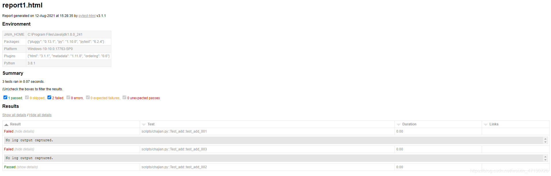 安装pytest测试报告插件 ????????1.在线安装? pip install pytest-html ????????2.离线安装 下载对应的离线安装包,解压后进入对应目录,执行python setup.py install ????????3.pycharm安装 ????????flie-setting-project-project interpreter-add:pytest-html install 使用 ????????在pytest配置文件中配置报告文件地址 ????????addopts = -s -v --html=./report.html ????????表示报告存储在当前配置文件目录下,并命名为report.html