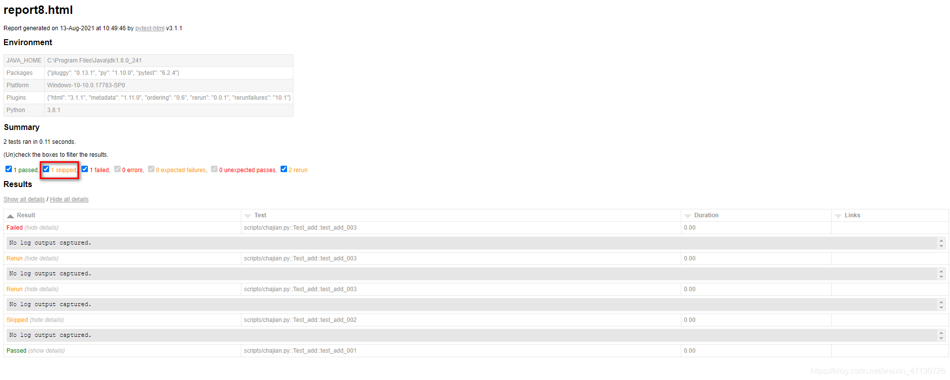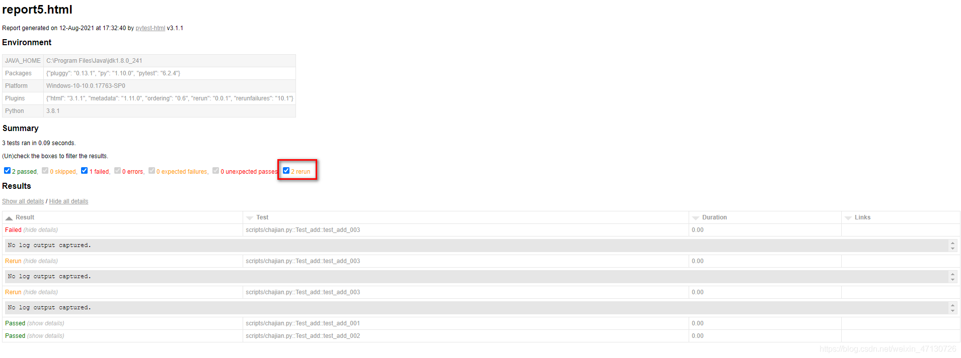 pytest-rerunfailures,pytest-rerun安装 ????????1.在线安装? pip install pytest-rerunfailures,pytest-rerun ????????2. 离线安装:下载对应的离线安装包,解压后进入对应目录,执行python setup.py install ????????3. pycharm安装 ????????flie-setting-project-project interpreter-add:pytest-rerunfailures install ????????pytest-rerun install 使用 ????????在配置文件的appopts参数行中增加对应的参数项:--reruns 3 ????????表示若执行失败,会自动将失败用例执行1次,再次执行成功则不会继续执行,若执行失败则继续执行,直至3次