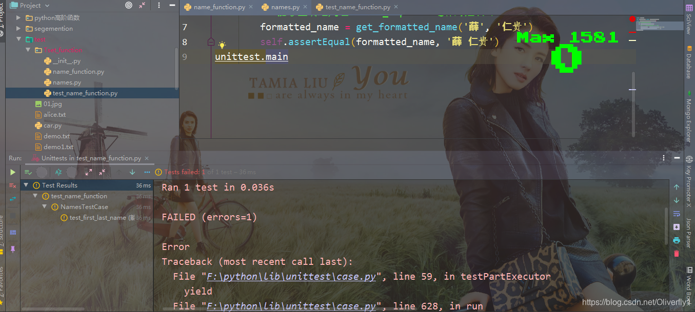 ??这个程序从name_function.py中导入get_formatted_name()。用户可输入一系列的名和姓,并看到格式整洁的全名:  ??从上述输出可知,合并得到的姓名正确无误。现在假设我们要修改get_formatted_name(),使其还能够处理中间名。这样做时,我们要确保不破坏这个函数处理只有名和姓的姓名的方式。为此,我们可以在每次修改get_formatted_name()后都进行测试:运行程序names.py,并输入像Stefan Oliver这样的姓名,但这太繁琐了。所幸Python提供了一种自动测试函数输出的高效方式。倘若我们对get_formatted_name()进行自动测试,就能始终信心满满,确信给这个函数提供我们测试过的姓名时,它都能正确的工作。 ??这里需要我们注意的是:我们在上图中可以看出在导入文件时候会有红色的波浪线,但是不要紧张,那不是报错,只是导入自己写的类就会出现红线。这点还需要读者格外的注意。