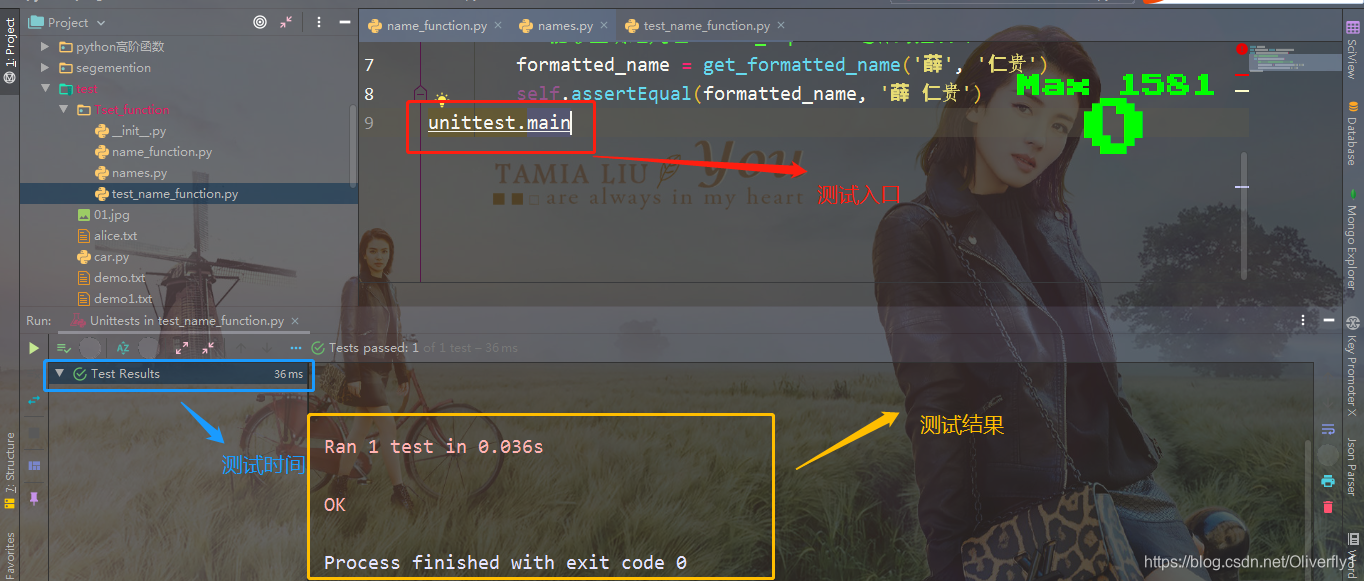 ??首先,我们导入模块unittest和要测试的函数get_formatted_name()。我们首先创建了一个名为NamesCase类,用于包含一系列针对get_formatted_name()的单元测试。当然我们可随便给这个类命名,但最好让它看起来与要测试的函数相关,并包含字样Test。这个类必须继承unittest.TestCase类,这样Python才知道如何运行我们编写的测试。 ??NamesTestCase只包含一个方法,用于测试get_formatted_name()的一个方面。我们将这个方面命名为test_first_last_name(),因为我们要核实的是只有名和姓的姓名能否正常的格式化。当我们运行test_name function.py时候,所有以test_打头的方法都将自动运行。在这个方法中,我们调用了要测试的函数,并存储了要测试的返回值。在这个示例中,我们要使用实参薛和仁贵调用get_formatted_name(),并将结果存储到变量formatted_name中。 ??另外,我们使用了unittest类最有用的功能之一:一个断言方法。断言方法用来核实得到的结果是否与期望的结果一致。在这里,我们知道get_formatted_name()的值为薛仁贵。为检查是否确实如此,我们调用unittest的方法assertEqual(),并向它传递formatted_name和薛仁贵.代码行self.assertEqual(formatted_name,薛仁贵的意思是说:将formatted_name的值同字符串薛仁贵相比较,如果它们相等,就OK了,如果他们不相等就返回消息。 ??代码行 unitest.main让Python运行这个文件的测试。具体结果如下:  ??上图的输出表明,给定包含名和姓的姓名时,函数get_formatted_name()总是能够正确的处理。修改get_formatted_name()后,可再次运行这个测试用例。如果它通过了,我们就知道在给定姓名时。这个函数依然能够正确处理。