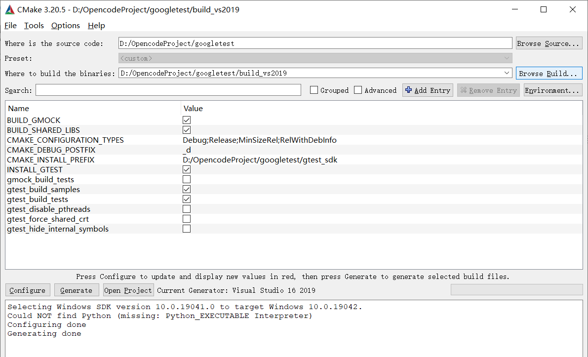 添加代码路径和生成后的目录,点击configure, 我编译的是win32版本  增加一个编译选项 CMAKE_DEBUG_POSTFIX,类型为STRING, value为 _d(这个随便写,只是为了区分debug和release的库)这样编译后的debug库就会自带一个d后缀,与release的好区分。  点击generate  出现以上结果表示sln生成ok, 点击open project即可打开项目,一共66个子项目,其中有lib和googletest的测试代码。  右键INSTALL项目,生成解决方案,即可把.h .lib .dll 提取到cmake编译时设置的CMAKE_INSTALL_PREFIX目录里,我的生成结果:  bin目录里是dll