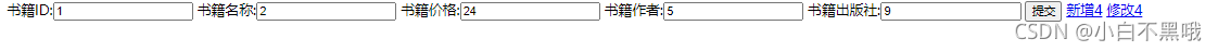 <!--重复参数处理代码冗余的问题 --> <form action="${pageContext.request.contextPath }/book.action?methodName=add" method="post"> ?? ?书籍ID:<input type="text" name="bid" value="1"> ?? ?书籍名称:<input type="text" name="bname" value="2"> ?? ?书籍价格:<input type="text" name="price" value="24"> ?? ?书籍作者:<input type="text" name="athor" value="5"> ?? ?书籍出版社:<input type="text" name="publish" value="9"> ?? ?<input type="submit"> </form>