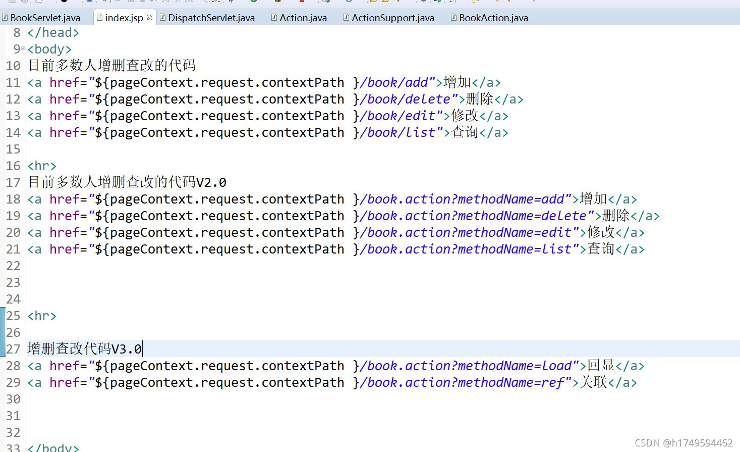 ?@Override ?? ?protected void doPost(HttpServletRequest req, HttpServletResponse resp) throws ServletException, IOException { ?? ??? ?//完成寻找子控制器的过程 ?? ??? ?//浏览器:http://localhost:8080/t266_mvc/book.action?methodName=add ?? ??? ?//目标:BookAction.add().... ?? ??? ?/** ?? ??? ? * ?? ?思路: ?? ??? ? * ?? ?1.从浏览器URL中获取到"/book"字符串 ?? ??? ? * ?? ?2.在子控制器中拿到BookAction ?? ??? ? * ?? ?3.BookAction.add() ?? ??? ? */ ?? ??? ?StringBuffer uri = req.getRequestURL(); ?? ??? ?uri.substring(uri.lastIndexOf("/"), uri.lastIndexOf(".")); //?? ??? ?action = BookAction ?? ??? ?ActionSupport action = actions.get(uri); //?? ??? ?ActrionSupport action = new BookAction() ?? ??? ?action.execute(req, resp); ?? ?}