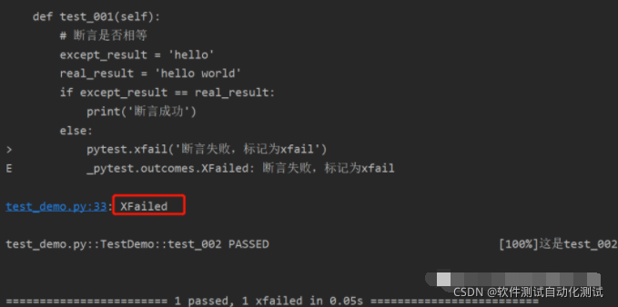 举个小例子,比如断言时,断言失败,我们就标记为xfail。
