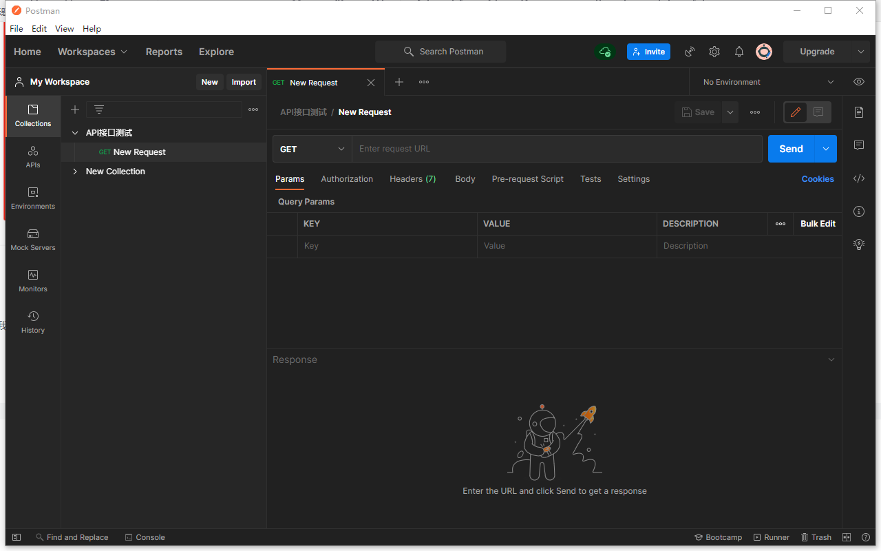 4、点击Collection功能之后,下一步我们来给这个集合进行修改重命名(不修改也是也是可以的,修改只是为了方便查看), ? ? ? 我已经是创建好了的一个“API接口测试”的集合,你们可以根据自己的想法来进行命名,(如图4所示界面)。