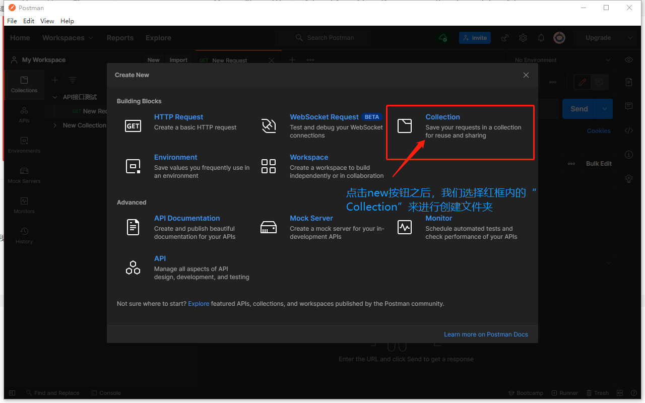 2、打开Postman之后,我们会看到左边模块中有一个“New”按钮,我们点开它来进行下一步操作(如图2所示界面)。