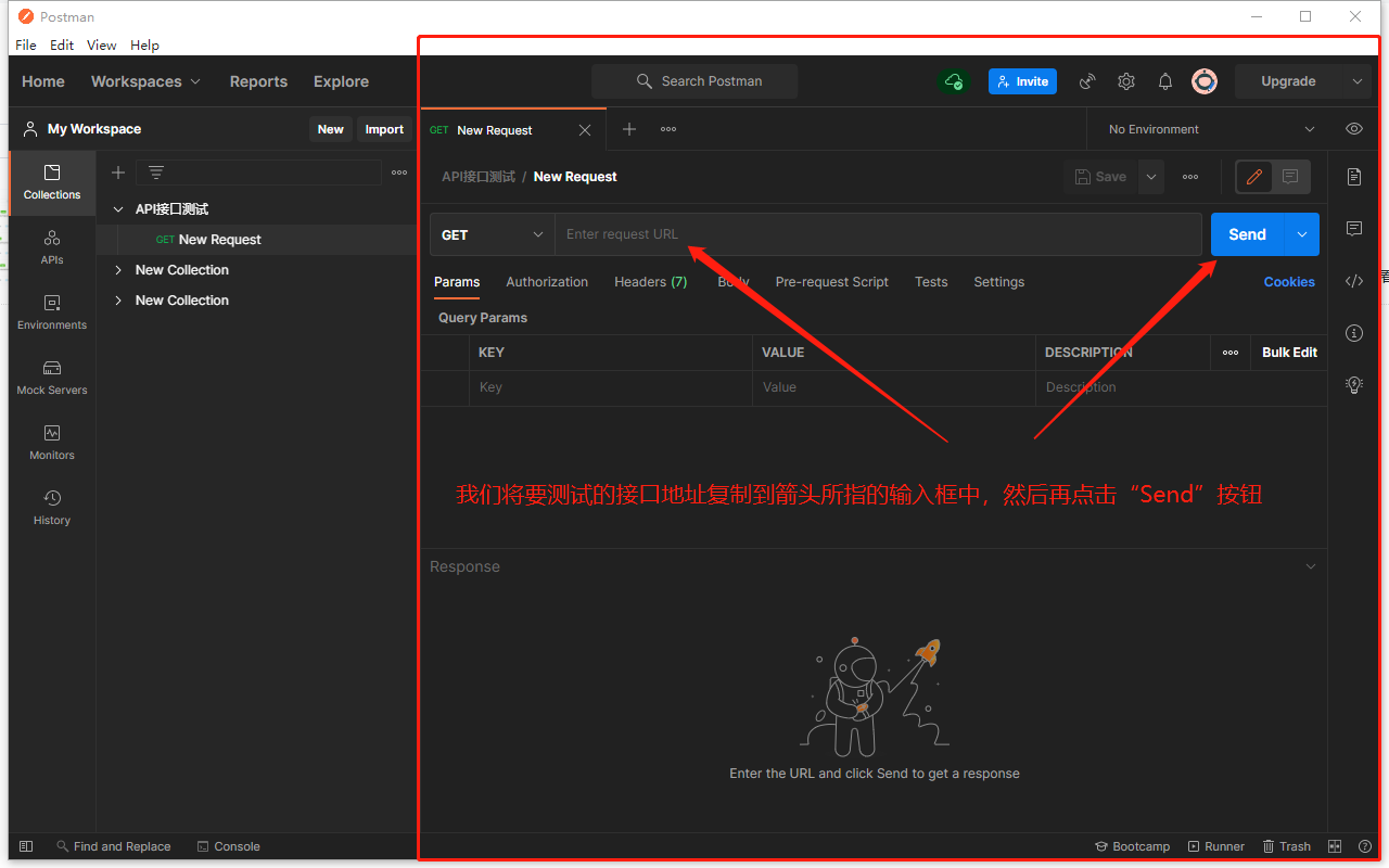 ? 6、右边所示模块界面,就是进行接口测试的界面,我们需要将接口复制粘贴到左边箭头所指的输入框内,之后点击“Send”按钮,来进行接口的测试(如图6所示界面)。
