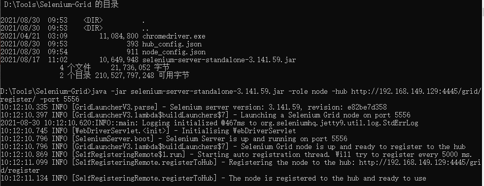 执行启动:java -jar selenium-server-standalone-3.141.59.jar -role node -nodeConfig nodeConfig.json (4)使用Grid执行代码????????编写代码使用Remote链接hub,然后运行, hub会自动分配到节点(node)运行程序
