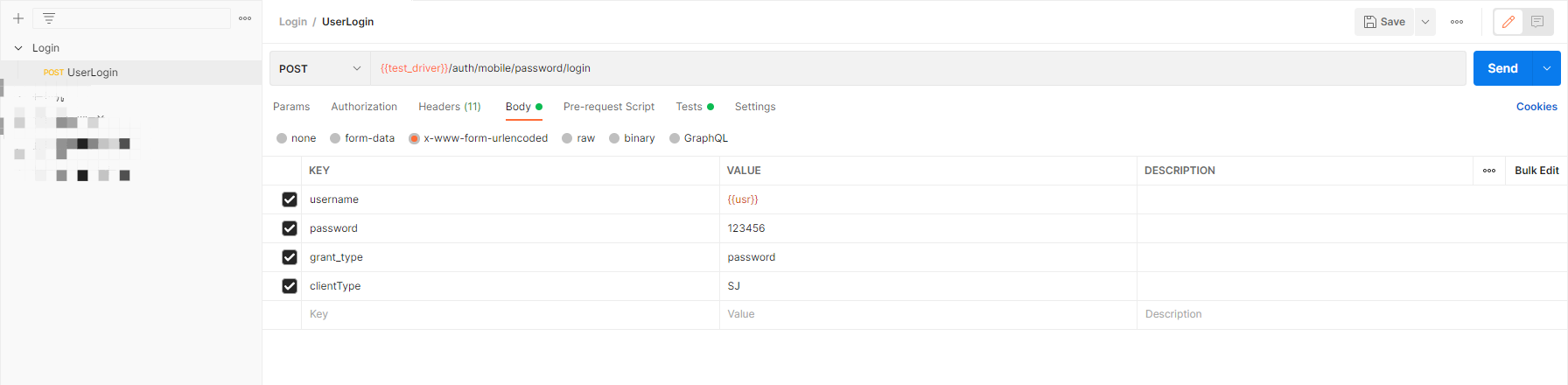 步骤三:创建接口,填写URL、参数数据,username请求参数取传入的数据{{usr}}