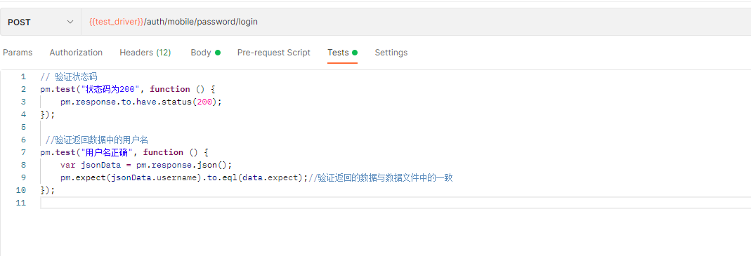 //?验证状态码 pm.test("状态码为200",?function?()?{ ????pm.response.to.have.status(200); }); ?//验证返回数据中的用户名 pm.test("用户名正确",?function?()?{ ????var?jsonData?=?pm.response.json(); ????pm.expect(jsonData.username).to.eql(data.expect);//验证返回的数据与数据文件中的一致 }); 步骤四:执行测试集