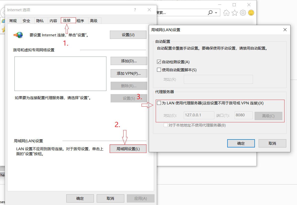 当Burp Suite 启动后,默认分配的代理地址和端口是 127.0.0.1 :8080;这些可以从Burp Suite 选项卡中Proxy下的可选择项Options中查看,我们必须保持Burp Suite设置的代理与我们Web浏览器所设置的代理与端口一致,这样Burp Suite 中间人角色才可以生效。  步骤: 1. 启动IE浏览器 2. 点击[工具]菜单按钮点击Internet选项 3. 点击连接选项卡,打开局域网设置让我们来进行设置,勾选复选框,将地址设为12.7.0.0.1 :80 ;确认。