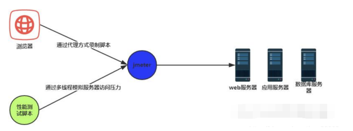 Jmeter可以作为web服务器与浏览器或者手机App应用的代理网关,以便捕获浏览器的请求和web服务器的响应,如此就可以很容易地生成性能测试脚本。有了性能测试脚本,Jmeter就可以通过线程来模拟真实用户对web服务器的访问压力,这与LoadRunner的工作原理基本一致。
