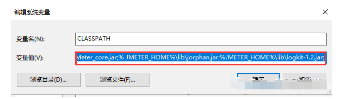 变量值:%JMETER_HOME%\lib\ext\ApacheJMeter_core.jar;% JMETER_HOME%\lib\jorphan.jar;%JMETER_HOME%\lib\logkit-1.2.jar;