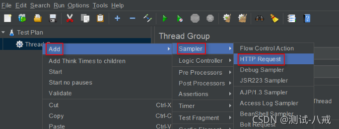?②Thread Group右键菜单,依次选择Add-->Sampler-->HTTP Request,建立一个http请求。