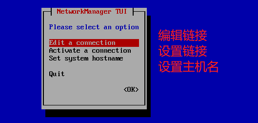 用 上下左右建控制 1.管理你的链接 2.激活和反激活你的链接 3.修改主机名称  修改主机名 第三项 回车 更改  编辑一个链接     创建成功  进行删除 激活 反激活 * 代表激活