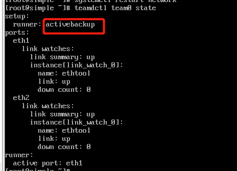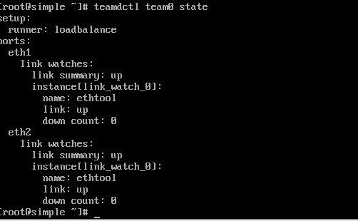 3.将指定网卡设备加入team0组成网络组 nmcli con add type team-slave con-name team0-port1 ifname eth1 master team0 # team-slave 从网卡 master 映射到team0 与链接无关 仅表示设备名称 nmcli con add type team-slave con-name team0-port2 ifname eth2 master team0 # ifname后网卡真实存在 让这块物理网卡手动绑定在逻辑接口team0上  执行完后 2个物理网卡被绑到team0的逻辑网卡上,就有2个网卡可以通信 任意一个断开链接,其他并不受到影响 加到 team逻辑网卡 里的 物理网卡 不可以有ip 4.查看team0设备链接是否已经创建 nmcli con up team0 teamdctl team0 state # 查看状态 针对设备名  与team通信是否正常 看 link summary up 通信正常 网线通信 数据是否正常传输 看link